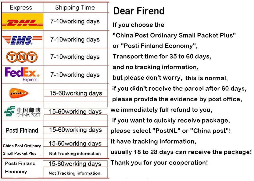 Shipping Notice We Will Send Parcel In 1-3 day Please give us the full name of receiver and the detailed address. Zip code and mobile phone is also very important. We have fixed the official query web site, if your need tracking information, please tell us, We will send the official link give you, if you do not understand, We can arrange the staff to follow up with you,Thank